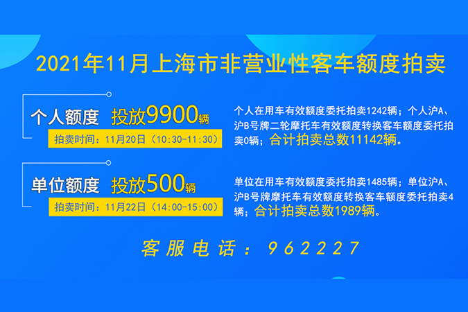拍卖数量:上海市单位非营业性客车额度500辆;单位在用车有效额度委托拍卖1485辆;单位沪A、沪B号牌二轮摩托车有效额度转换客车额度委托拍卖4辆;合计拍卖总数1989辆。