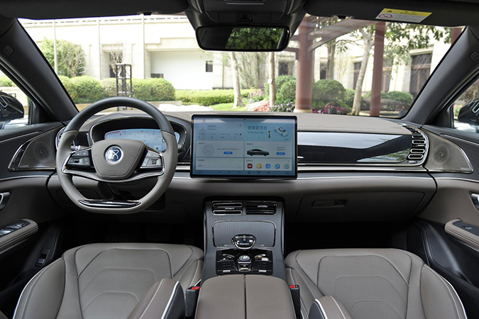 内饰方面,比亚迪汉EV创世版的内饰配色变得更高雅,咖啡色与黑色搭配,以及Nappa真皮加持,更具高级感。中控台也升级为木纹饰板,包括变速箱排挡前方的区域。中控屏的界面设计进行了一定的优化,视觉上更简约,同时App LOGO更为立体化。车内新增W-HUD抬头显示,显著提升行车安全性。